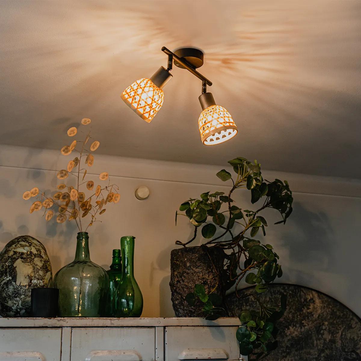 Technické údaje: Ďalšie funkcie:Stmievateľné, stmievač nie je súčasťou balenia,Nie, bez kábla a zástrčky Toto krásne bodové svetlo Rayan rozžiari váš interiér! Vďaka kombinácii čiernej ocele a bambusových bodových svetiel sa dokonale hodí do vášho orientálneho interiéru. Mriežka umožňuje žiarovke vyniknúť a vytvára pekný svetelný efekt na stene. Bodové svetlo má 2 tienidlá, ktoré sa dajú nastaviť samostatne, takže sa môžete rozhodnúť, kam chcete, aby svetlo svietilo. Ďalej má Rayan výšku 21 cm, dĺžku 45 cm a šírku 10 cm. Bodové svetlo môžete doplniť 2 LED žiarovkami, ktoré sa zmestia do malej objímky E14 s maximálnym výkonom 25 wattov, ktoré si môžete objednať samostatne.