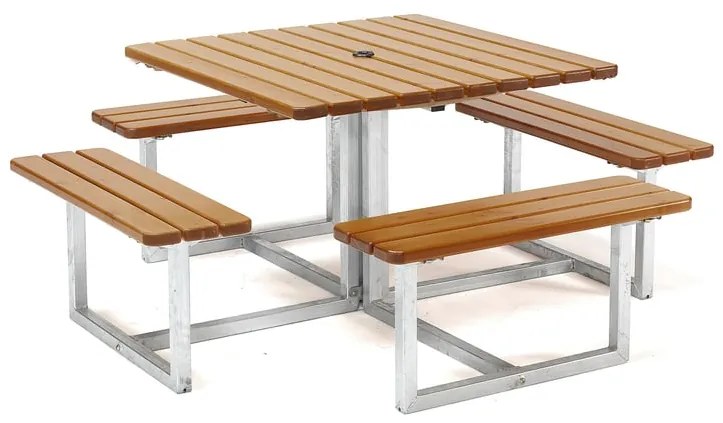 Štvorcový piknikový stôl s moderným dizajnom. Stôl má štyri pevné lavice, ktoré poskytujú dostatok miesta na sedenie. Uprostred stola je otvor pre slnečník. Stôl aj lavice majú zaoblené rohy a hrany. Piknikový stôl HJORTRON je moderný exteriérový stôl s lavicami, ktorý je ideálny pre rušné miesta na stolovanie pod holým nebom, napríklad v školách alebo vonkajších oddychových zónach. Stôl sa tiež nájde svoje využitie na odpočívadlách, v parkoch, baroch a pod. Otvor uprostred stola umožňuje osadiť stôl slnečníkom, ktorý poskytuje tieň pred slnkom alebo ochranu pred dažďom. Doska stola a lavice sú vyrobené z borovicových lamiel. Rám je vyrobený zo žiarovo pozinkovanej ocele.