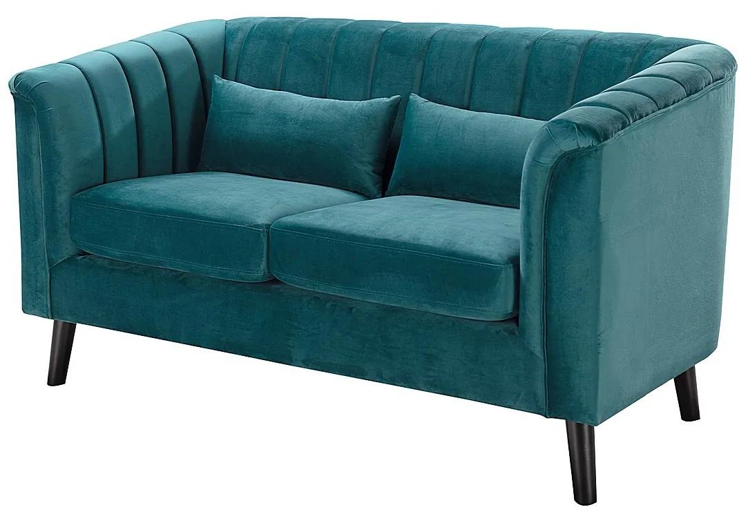Štýlová dvojmiestna pohovka v netypickej farbe morskej zelenej. Spája v sebe súčasný dizajn a elegantnú úpravu zamatovou textíliou. Výnimočný tvar a hladké zamatové čalúnenie utvárajú nadčasový nabytok. V každom interiéri bude pohovka vytvárať silný dizajnerský prvok. Mäkké, komfortné sedenia zapínané na suchý zips, sú vyplnené penou. Vankúše majú na zips zapínané povrchy, ktoré je možné s ľahkosťou stiahnuť a vyprať. Drevené, odolné nohy v čiernej farbe dodajú nábytku ľahkosť a individuálny výraz. V súprave sú dva ozdobné vankúše, ktoré naviac lákajú na relax. Pohovka Meriva sa stane ideálnym doplnkom pri množstve úprav – moderných či vintage interiérov, ale tiež loft či škandinávskeho štýlu. Je to taktiež zaujímavé riešenie do salónu, hotelovej sály alebo kaviarne. Rozmery: šírka 156,5 cm, hĺbka 83,5 cm, výška 88 cm, sedenie – šírka 118 cm, hĺbka 55 cm, výška na sedenie 51,5 cm, výška nôžky 18,5 cm. Materiál: zamat. Farba: morská zelená. Nôžky: drevené, čierne.