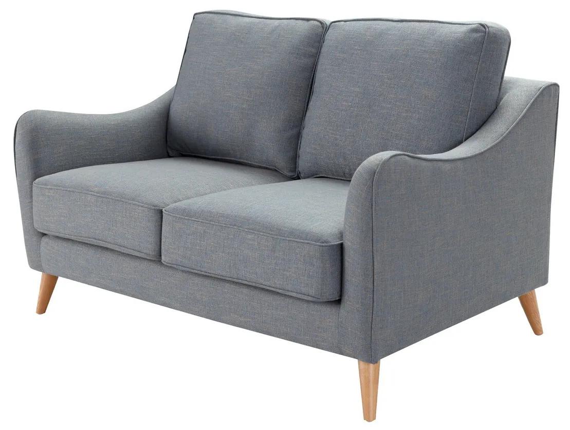 Moderná dvojmiestna pohovka v džínsovej farbe s jemnými akcentmi hnedej.