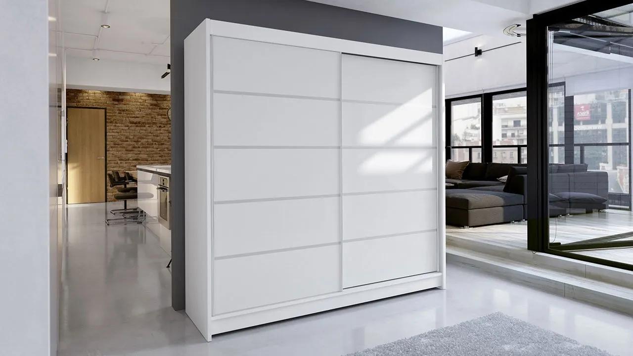 Veľká posuvná skriňa Bar IV je dobre usporiadaný úložný priestor. Na police vnútri môžete ľahko umiestniť zložené oblečenie, ako aj doplnky, ako sú tašky, klobúky a šatky. Svoje obľúbené oblečenie budete chrániť pred nadmerným pokrčením tak, že ich umiestnite do časti, kde sa na vešiakoch zavesia šaty. Na druhej strane, horné police sú skvelým miestom pre zriedkavo používané veci, kufre alebo náhradné prikrývky.Výhodou šatníka je aj široký výber farieb. Použitím dostupnej farebnej palety nakonfigurujete kus nábytku, ktorý dokonale ladí s ostatnými prvkami vybavenia obývacej izby, spálne alebo haly.Rozmery:šírka: 180 cm,výška: 215 cm,hĺbka: 58 cmPrevedenie:korpus a front: laminovaná doska s hrúbkou 16 mm,priečky a police: 16 mm laminovaná doska,všetky prvky v matnej doske,dyha z PVC,systém posuvných dverí Sevroll,kľučka vo forme hliníkového pásu pozdĺž dverí,hliníkové kľučky používané v posuvných dverách zdôrazňujú ich moderný štýl, zlepšujú ich funkčnosť a bránia v ohýbaní dverí,RGB LED osvetlenie ako doplnková možnosť za príplatok (15 variabilných farieb + diaľkové ovládanie)Záruka: 24 mesiacov