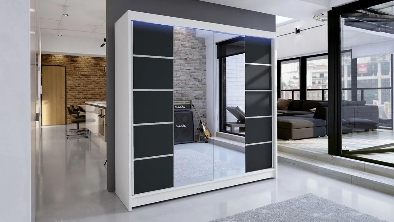 Potrebujete veľkú šatníkovú skriňu, ktorá bude ponúkať police a tyč pre vešiaky? Náš návrh je posuvná skriňa Bar V! Šírka šatníka je 180 cm a výška 215 cm. Priečky a police sú vyrobené z rovnakej dosky ako telo, vďaka čomu sú odolné a stabilné. Posuvné dvere pracujú zľahka a ich otváranie uľahčuje rukoväť vo forme hliníkového pruhu, ktorý vedie pozdĺž dverí. Rukoväte dodávajú šatníku moderný vzhľad a zabraňujú jej ohnutiu.Predná časť skrine je kombináciou veľkého zrkadla, matnej povrchovej úpravy a ozdobných lamiel. Okrem toho môže byť šatník osvetlený LED diódami.Rozmery:šírka: 180 cm,výška: 215 cm,hĺbka: 58 cmPrevedenie:korpus a front: laminovaná doska s hrúbkou 16 mm,priečky a police: 16 mm laminovaná doska,všetky prvky v matnej doske,dyha z PVC,systém posuvných dverí Sevroll,kľučka vo forme hliníkového pásu pozdĺž dverí,hliníkové kľučky používané v posuvných dverách zdôrazňujú ich moderný štýl, zlepšujú ich funkčnosť a bránia v ohýbaní dverí,RGB LED osvetlenie ako doplnková možnosť za príplatok (15 variabilných farieb + diaľkové ovládanie)Záruka: 24 mesiacov
