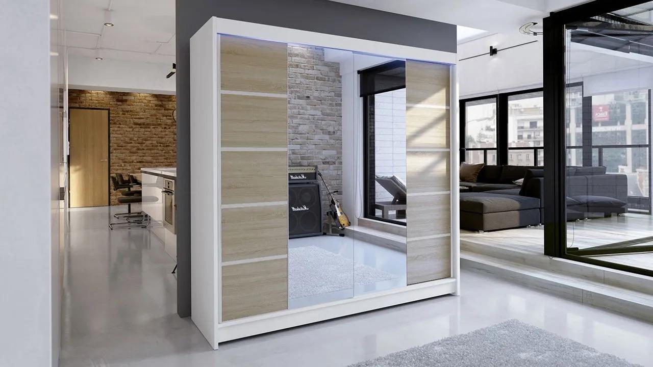 Potrebujete veľkú šatníkovú skriňu, ktorá bude ponúkať police a tyč pre vešiaky? Náš návrh je posuvná skriňa Bar V! Šírka šatníka je 180 cm a výška 215 cm. Priečky a police sú vyrobené z rovnakej dosky ako telo, vďaka čomu sú odolné a stabilné. Posuvné dvere pracujú zľahka a ich otváranie uľahčuje rukoväť vo forme hliníkového pruhu, ktorý vedie pozdĺž dverí. Rukoväte dodávajú šatníku moderný vzhľad a zabraňujú jej ohnutiu.Predná časť skrine je kombináciou veľkého zrkadla, matnej povrchovej úpravy a ozdobných lamiel. Okrem toho môže byť šatník osvetlený LED diódami.Rozmery:šírka: 180 cm,výška: 215 cm,hĺbka: 58 cmPrevedenie:korpus a front: laminovaná doska s hrúbkou 16 mm,priečky a police: 16 mm laminovaná doska,všetky prvky v matnej doske,dyha z PVC,systém posuvných dverí Sevroll,kľučka vo forme hliníkového pásu pozdĺž dverí,hliníkové kľučky používané v posuvných dverách zdôrazňujú ich moderný štýl, zlepšujú ich funkčnosť a bránia v ohýbaní dverí,RGB LED osvetlenie ako doplnková možnosť za príplatok (15 variabilných farieb + diaľkové ovládanie)Záruka: 24 mesiacov