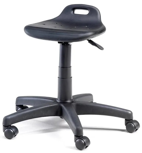Pracovná stolička s kolieskami, ktorá je praktická pri práci v nepohodlných polohách. Stolička je výškovo nastaviteľná a má pevné sedadlo s mierne zdvihnutým zadným okrajom. Dielenská stolička uvoľní Váš chrbát, kolená a členky pri práci v nepohodlných pracovných pozíciách. Je ideálna, ak často pracujete v polohách drepu alebo kľaku. Táto pracovná stolička je vhodná do ťažších pracovných prostredí ako sú napríklad garáže, obchody, lekárske kliniky a centrá dennej starostlivosti. Sedadlo je výškovo nastaviteľné pomocou plynového piestu. Je pevné, vyrobené z plastu, vďaka čomu sa ľahko čistí. Zdvihnutý zadný okraj sedadla poskytuje dodatočnú oporu pre chrbát.