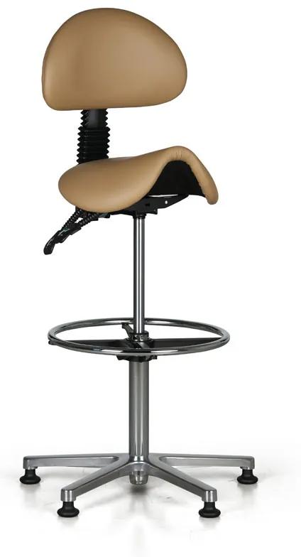 · pracovná stolička so sedadlom špeciálne tvarovaným ako sedlo · nastaviteľná výška pomocou plynového piestu · pohodlie pri práci vďaka operadlu a sedadlu vyplnenými penou s vysokou hustotou · s opierkou nôh s priemerom 450 mm · stabilitu zaisťuje päťramenný chrómovaný kríž s priemerom 600 mm · s klzákmi s priemerom 50 mm · nosnosť 140 kg