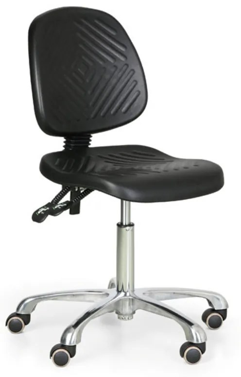 · sedadlo a operadlo z polyuretánu (PUR) vo vodivej úprave splňujúcej normy pre ESD – antistatické prostredie · mechanika s permanentným kontaktom pre chrbát sediaceho · plynulé nastavenie výšky plynovým piestom · päťramenná báza z lešteného hliníka priemer 620 mm · kolieska pre mäkké podlahy · pracovná stolička antistatické prevedenie · nosnosť do 130 kg