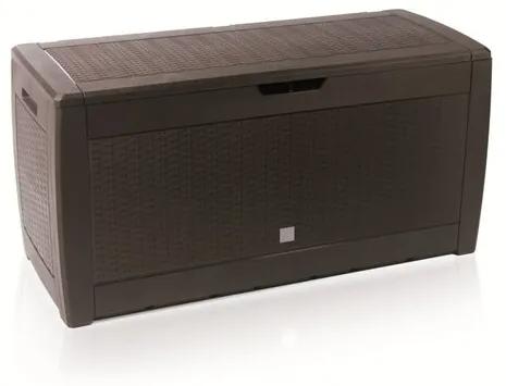 Záhradný plastový úložný box so vzorom ratanu. Je vhodný pre uskladnenie polstrov, záhradného náradia, domácich potrieb či hračiek. Boxu je opatrený aj úchytmi pre ľahké presúvanie.Box je vodeodolný, nie však vodotesný. Nemal by sa používať v zimnom období, plast môže v mrazoch skrehnúť a tým sa poškodiť.