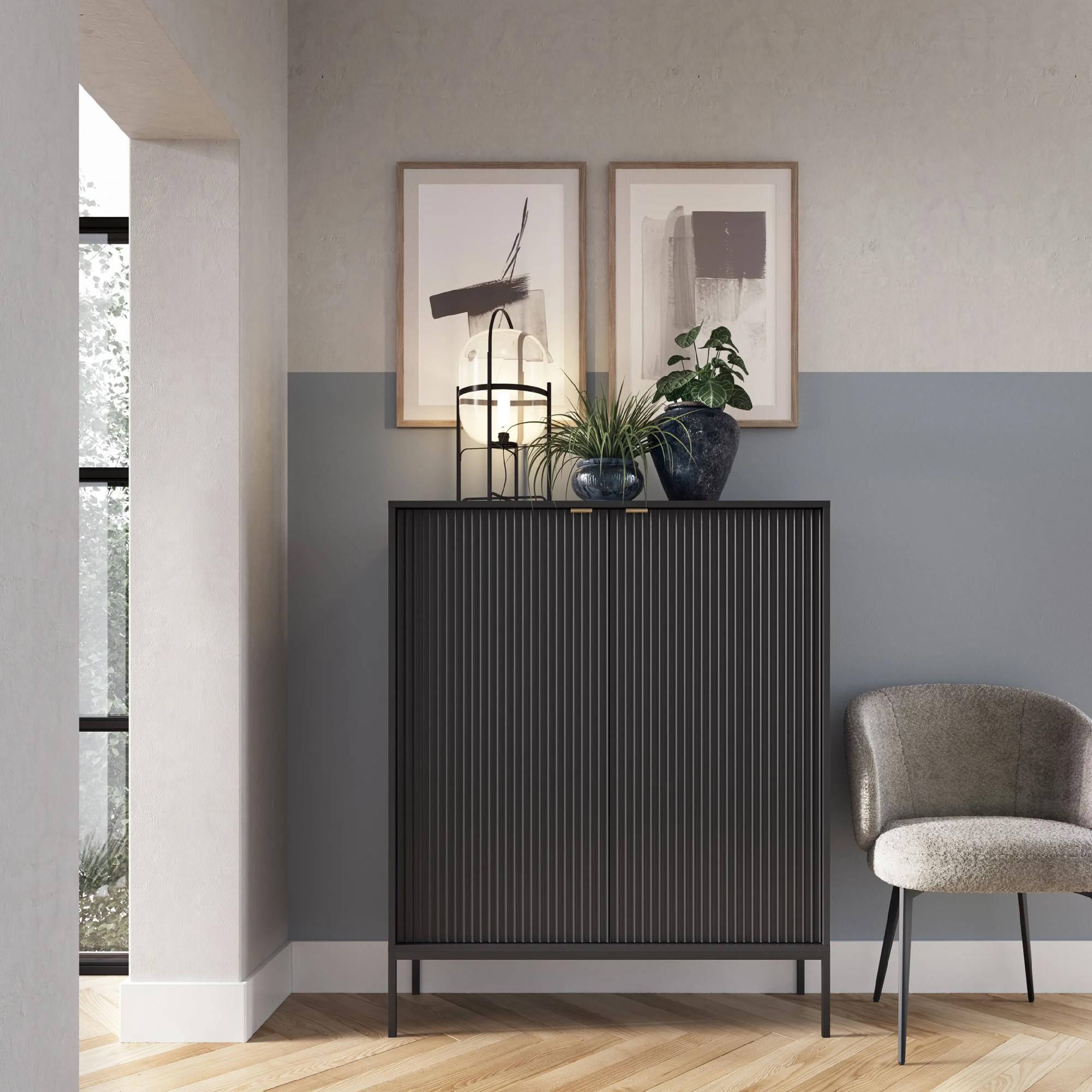 Skrinka zo série nábytku NOVA vyniká svojimi zlatými detailami, ktoré jej pridávajú na elegancii. Do vašej obývacej izby prinesie dostatok úložného priestoru a za zmienku stojí aj to, že stojí na vysokých nohách, čo vám zjednoduší údržbu podláh. Komoda má praktické rozmery.