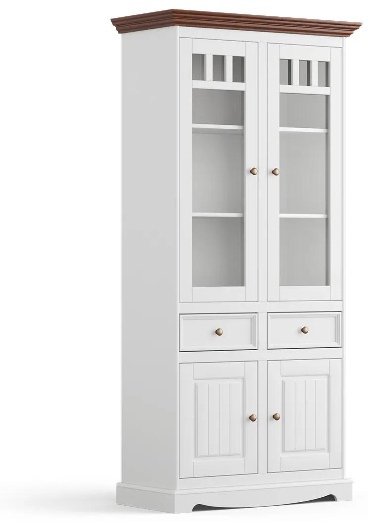 Pozrite si jedinečné detaily sklenenej vitríny zblízka! Jedným z nich je vysoká základňa, ktorá je zdobená horizontálnym frézovaním. Základňa je “čerešničkou na torte” celého dizajnu. Čelá vitríny sú zdobené vertikálnymi drážkami a rámčekmi (skrinky sú zdobené jednoduchým širokým rámčekom, zásuvky úzkym a frézovaným rámčekom). Dopĺňajú ich kovové rukoväte v starostriebornej farbe, ktoré zdobia vitrínu v provensálskom štýle.