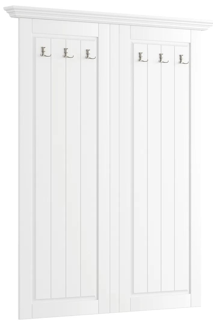 Pri zostavovaní dvojitého panelu s vešiakmi sme mysleli na úžitkový aspekt nábytku. Splní požiadavky veľkej rodiny alebo Vašich početných hostí. Bude sa hodiť na rodinné oslavy, ako sú meniny, narodeniny alebo sviatky. Panel vešiaka je vyrobený z prírodného borovicového dreva a natretý bielou vodou riediteľnou farbou s 85 % krycou schopnosťou. Vlákno a suky sú ľahko viditeľné cez farbu vytvrdenú UV žiarením. Estetické frézovanie a použitie konštrukcie založenej na vonkajšom ráme nám dáva záruku, že takýto veľký kus nábytku, ktorý je závesnou doskou, sa nebude prehýbať. Použitie dvojitých saténových vešiakov umožňuje zavesiť dvakrát viac odevov ako jednoduché vešiaky.