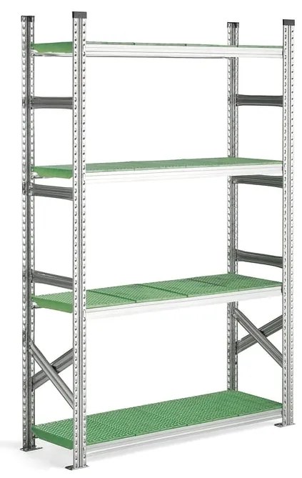 Flexibilný regál s perforovanými policami vhodnými na potraviny. Dodáva sa so zmontovanými koncovými rámami. Ľahká montáž bez použitia skrutiek. Je vhodný na použitie v mraziacich priestoroch steplotou do –30˚C. Tento odolný regál je vynikajúcou voľbou pre obchody a sklady, kde je hygiena zvlášť dôležitá. Kombinuje vysokú nosnosť s nízkou vlastnou hmotnosťou a dodáva sa s policami schválenými na skladovanie potravín. Jednou z výhod políc je ich perforácia, ktorá umožňuje odtečenie tekutiny. Vďaka tomu sa tiež na policiach nehromadí prach a sú hygienickejšie. Police sú priamo uložené na nosníkoch, čo umožňuje jednoduché odnímanie ačistenie. Táto základná sekcia sa skladá z dvoch koncových rámov s výstužami a štyroch políc. Police sa dajú umiestniť do ľubovoľnej výšky a dajú sa ľahko posúvať nahor alebo nadol. Koncové rámy sa dodávajú zmontované, čo uľahčuje montáž regálového systému. Stačí už len zavesiť jednotlivé police do požadovanej výšky medzi rámy a je to hotové. Vďaka tomu je možné ľahko zmeniť konfiguráciu systému podľa toho, ako sa menia vaše potreby skladovania. Pridajte ďalšie police alebo rozšírte základnú sekciu o ľubovoľný počet prídavných sekcií. POZNÁMKA: Celková šírka = šírka police +75mm pri základnej sekcii; pri prídavnej sekcii potom šírka police +10mm.