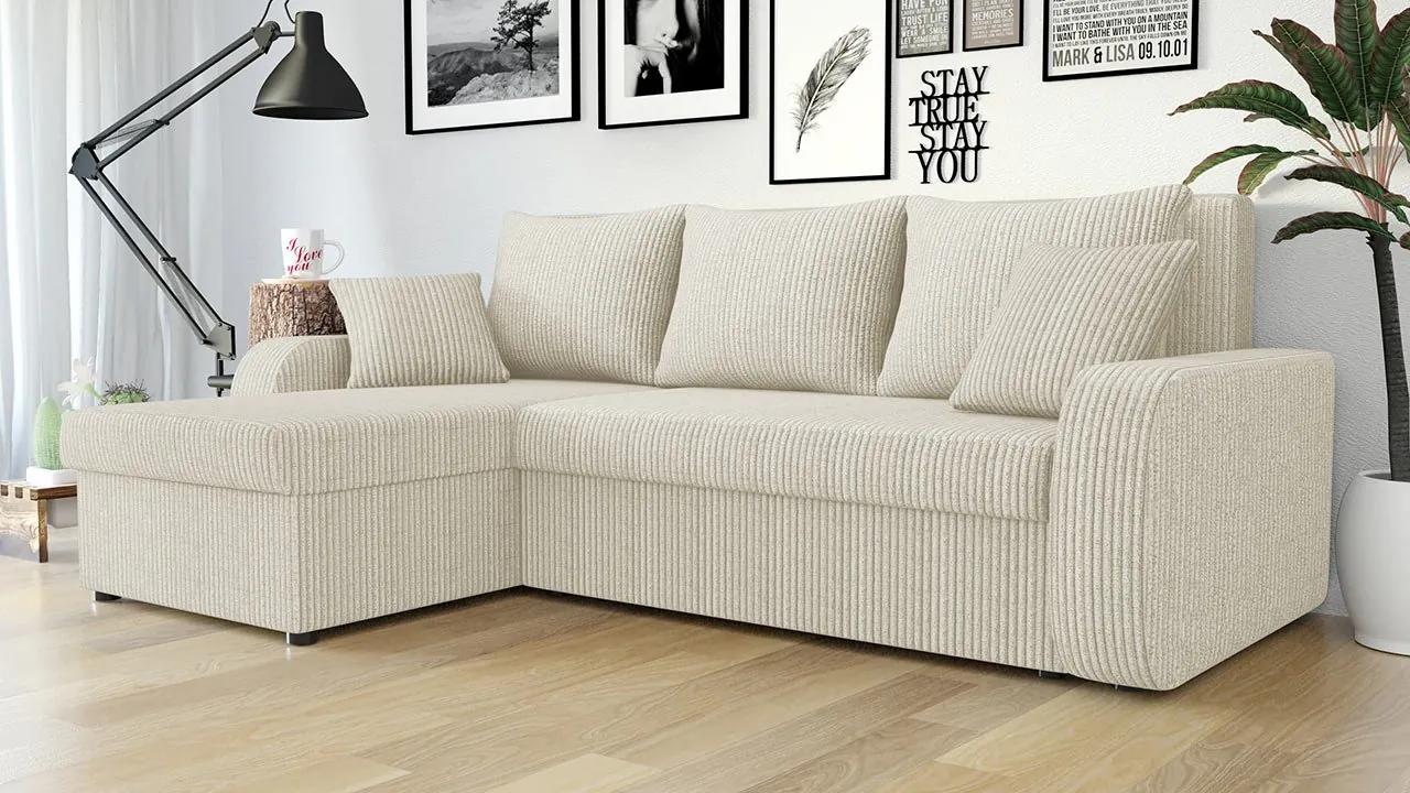 Jednoduchý a klasický dizajn rohovej rozkladacej sedacej súpravy Dalmir je prerušený menčestrovou látkou so zaujímavou textúrou. Čalúnený nábytok pokrytý týmto typom materiálu sa vrátil vo veľkom štýle a stal sa stálicou moderných zariadení obývacej izby či spálne.Rohová sedacia súprava s funkciou spánku ponúka dva priestranné úložné boxy, do ktorých sa zmestia všetky vaše veci. Súprava obsahuje dva dekoračné vankúše potiahnuté tiež menčestrovou látkou.Rohová rozkladacia súprava Dalmir je cez deň skvelou dekoráciou do obývačky a v noci poslúži ako veľká posteľ pre pohodlný odpočinok.Rozmery:dĺžka: 238 cmšírka: 147 cmvýška: 80 cmSpacia plocha: 200 x 122 cmRohová strana: univerzálna (stranu si volí zákazník pri montáži)Prevedenie:rám: drevo + nábytková doskaT2844 pena (hrúbka 10 cm) + vatarozkladaciamá funkciu spánkudva úložné priestoryplastové okrúhle nohyoperadlo vo forme voľne položených vankúšovsada vankúšov: tri veľké + dva malévankúše na zipsvoľne stojaca sedačka (zadná strana potiahnutá látkou)Záruka: 24 mesiacov