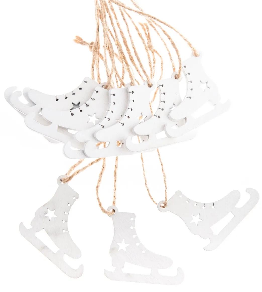 Nádherná sada drevených korčulí sa bude hodiť na ozdobenie vianočného stromčeka, umelej girlandy alebo vetvičiek vo váze. Korčule majú na sebe vyrezávané detaily.