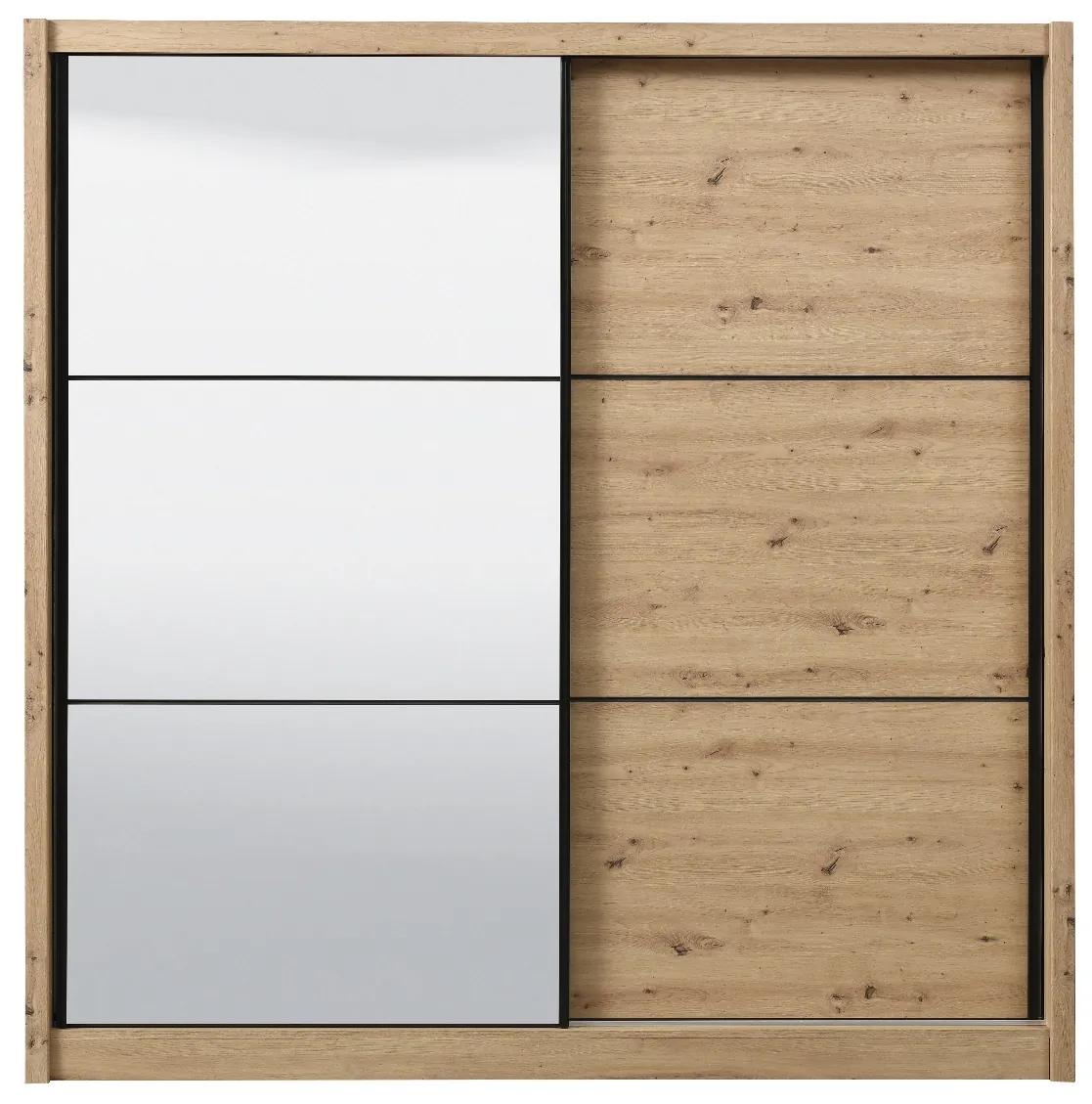 Kolekciu šatníkových skríň Debby si obľúbite najmä jej praktickému prevedení. Vďaka posuvným dverám môžete tieto skrine umiestniť do priestoru, kde je problém s klasickým otváraním. Z kolekcie Debby môžete objednať skrine rôznych šírok a odtieňov, so zrkadlom alebo bez zrkadla. Ponúkaná skriňa Debby je vyrobená z lamina hrúbky 16 mm, v dekore dreva dub artisan a šírky 213cm. Jedny posuvné dvere sú zrkadlové, druhé dvere sú v dekore dreva dub artisan. Vďaka vnútornému priestoru, ktorý je rozdelený na policovú časť a priestor s hornou policou a tyčou na šaty, môžete do skrine umiestniť ako veľké kabáty, bundy, košele, tak drobné oblečenie a iné doplnky. Čielka posuvných dverí majú deliacu pruhy, ktoré dávajú skrini osobitý vzhľad.