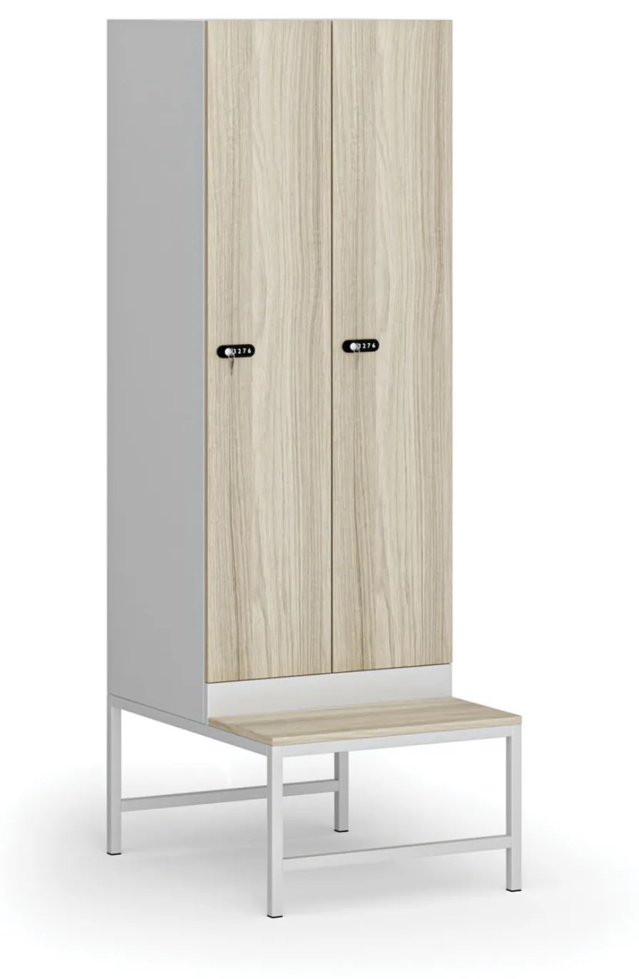 · moderná dvojdverová šatníková skriňa s naloženými dverami z laminovanej drevotriesky · hrúbka dvierok 18 mm, olepené ABS hranou · s lavičkou s výškou 375 mm · konštrukcia vyrobená z kvalitného oceľového plechu s hrúbkou 0,6 mm · montážne otvory v bokoch korpusu pre vzájomné spojenie do radov · vo vnútri každého oddielu je nerezová šatníková tyč a plastové háčiky · cirkulácia vzduchu pomocou vetracích otvorov umiestnených v zadnej časti · na výber varianty s cylindrickým zámkom a dvoma kľúčmi, elektronickým kódovým zámkom, mechanickým kódovým zámkom alebo otočným na použitie kladky na číslo či na kľúč (kladka nie je súčasťou dodávky) · farba korpusu skrine je vždy svetlo sivá, laminované dvere môžete vyberať v týchto odtieňoch: breza, dub prírodný, buk, orech, biela · skriňa je dodávaná v demontovanom stave