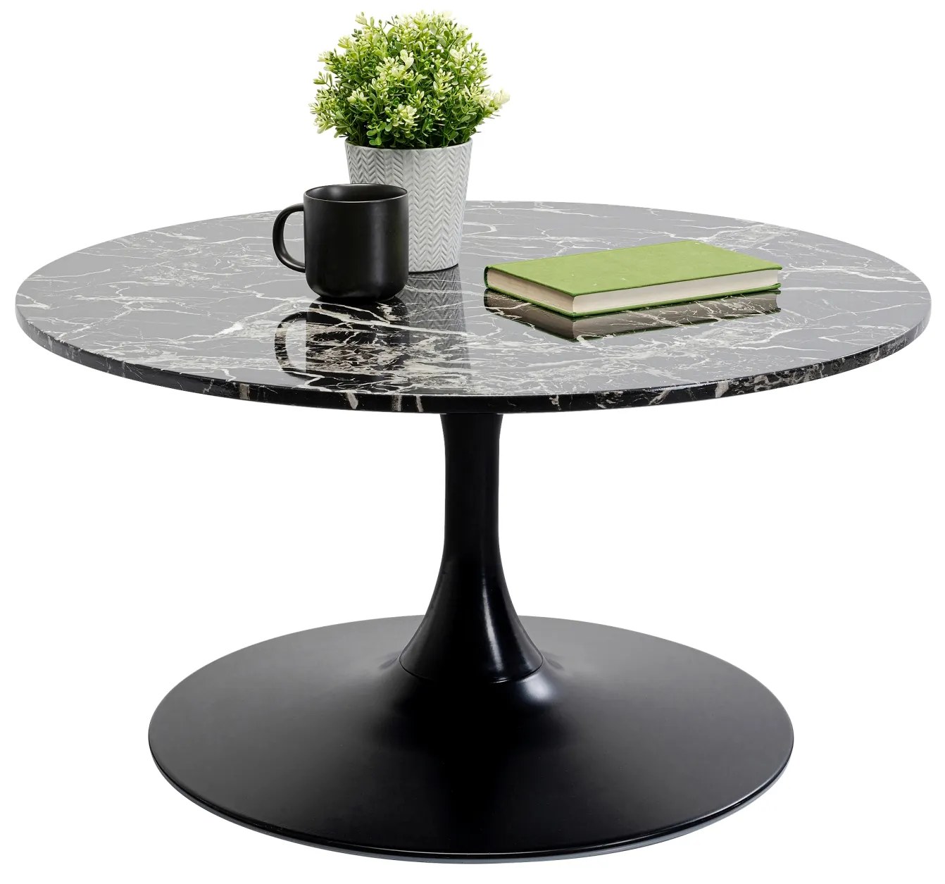 Štýlový konferenčný stolík Schickeria v dominantnej čiernej farbe s dekorom mramoru a priemerom stolovej dosky 80 cm.