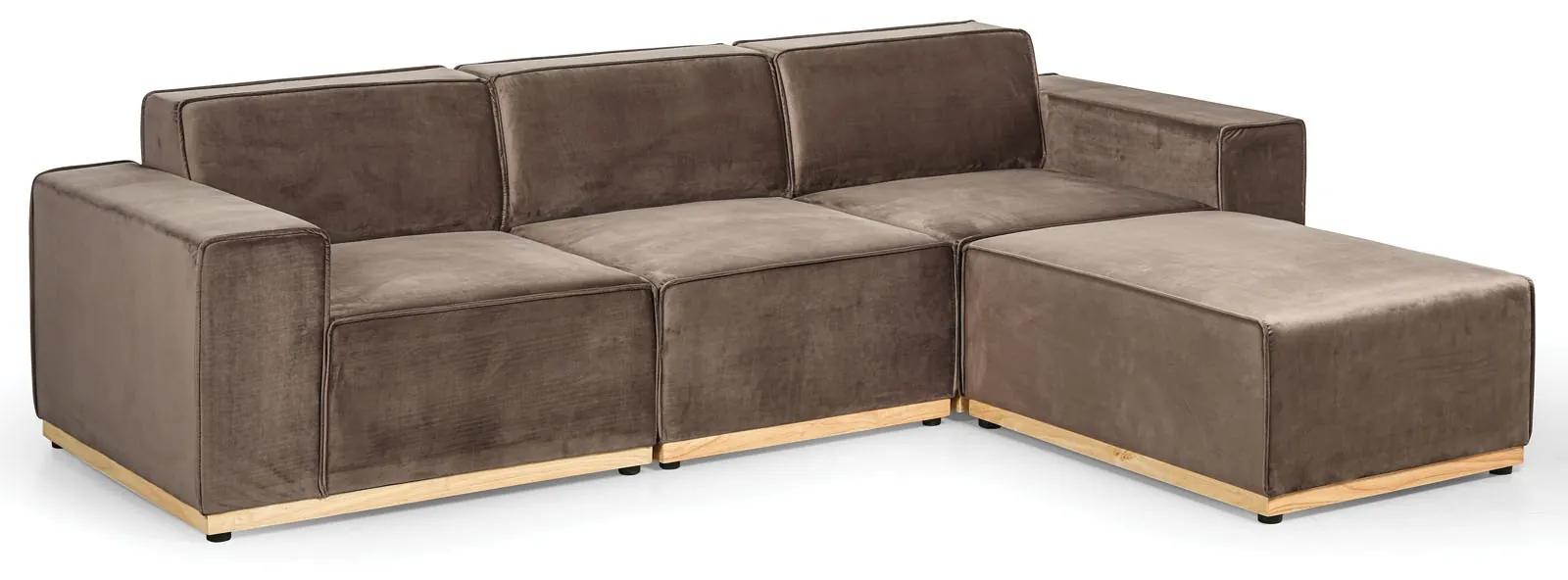 · Rozmery (V x Š x H): 700 x 2590 x 1840 mm · Rozmery samostatného taburetu (V x Š x H): 400 x 690 x 940 mm · Materiál poťahu: látka/semiš · Materiál konštrukcie: Eukalyptový masív + preglejka · Materiál výplne: PU pena · Výška sedadla: 400 mm · Výška operadla: 320 mm · Nosnosť: 350 kg · Počet miest na sedenie: 3
