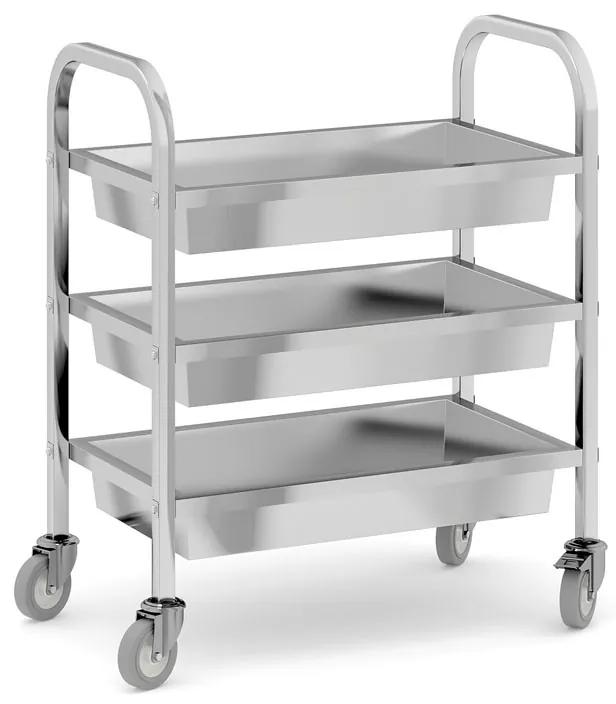 Tento servírovací vozík je praktickým riešením pre ľahké a pohodlné prepravovanie jedla, nápojov alebo ďalšieho vybavenia v rôznych gastro prevádzkach. Vozík obsahuje tri vane s vysokými bočnicami, ktoré zabraňujú vypadnutiu prepravovaných predmetov a zaisťujú ich bezpečnú prepravu. Priestor medzi policami je 260 mm, čo poskytuje dostatok miesta na prepravu rôznych pokrmov a riadu. Vozík je osadený štyrmi kolesami, z toho sú dve brzdené, čo zaisťuje jeho ľahký a bezpečný pohyb a aretáciu. Celková nosnosť vozíka je 150 kg, takže dokáže bez problémov uniesť všetko potrebné. Šírka nehrdzavejúceho plechu, ktorý tvorí povrch vozíka, je 0.8 mm, a šírka rúrok je 0.9 mm. Tieto rozmery zaručujú dostatočnú pevnosť a odolnosť vozíka, čo je kľúčové pre jeho dlhodobú použiteľnosť v náročných profesionálnych podmienkach.