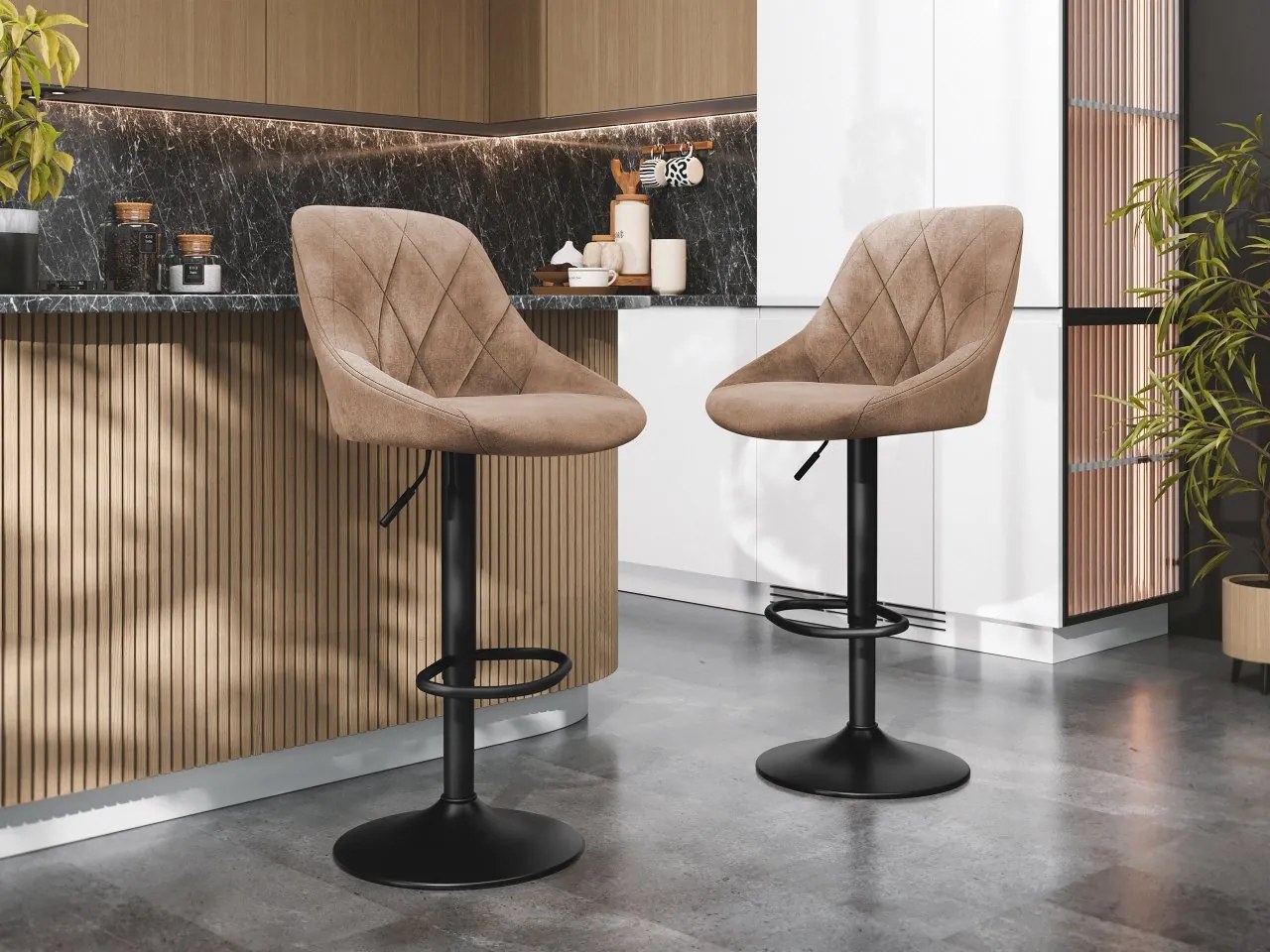 Sada dvoch čalúnených stoličiek H101 sa bude skvele hodiť do každej modernej kuchyne či jedálne. Sedadlá majú zaoblené tvary a ponúkajú pohodlnú oporu pre chrbát aj boky.Velúrové stoličky sú vybavené výškovým nastavením, čo umožňuje ich prispôsobenie rôznym typom dosiek a kuchynských ostrovčekov. Kovová konštrukcia so širokou, okrúhlou základňou zaisťuje stabilitu a pravouhlé opierky nôh ponúkajú dodatočný komfort pre nohy. Stoličky H101 dokonale zapadnú do moderných interiérov a dodajú štýlový a praktický akcent.Rozmery:šírka: 47 cm,výška: 84-106 cm,výška sedadla: 60-82 cm,hĺbka: 47 cm,hĺbka sedadla: 37 cmPrevedenie:rám: kov s čiernym práškovým nástrekom,nastaviteľná výška – výška sa dá meniť pomocou pneumatického zdvihu,predávame len ako set (cena je za dva kusy)Záruka: 24 mesiacov
