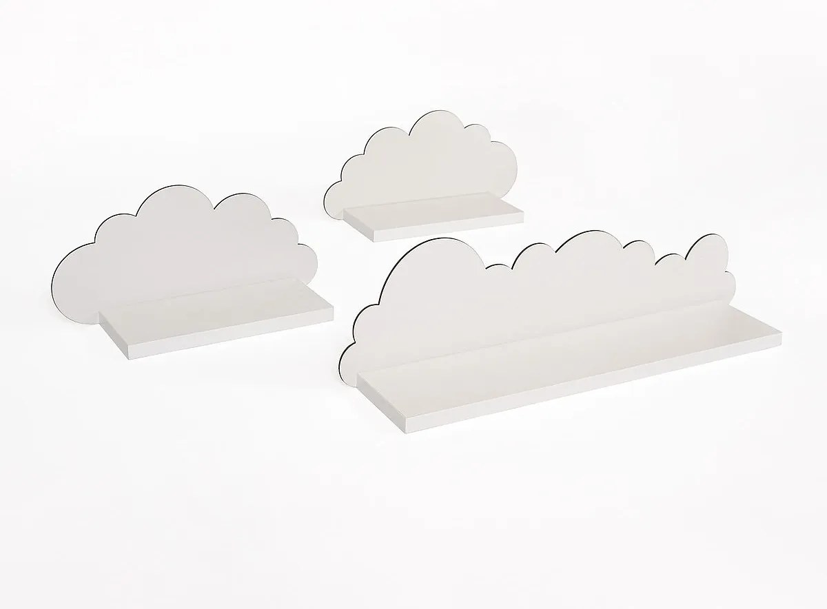 Set 3 poličiek v tvare mráčika, ktoré oživia múr každej detskej izbičky. Jemné prevedenie a neutrálna biela farba políc dodá izbe moderný a štýlový vzhľad. Knižka, fotka v rámčeku či iné drobnosti nájdu svoje miesto na jednom z troch obláčikov, a izbička vašich deti sa stane krajšou a útulnejšou.
