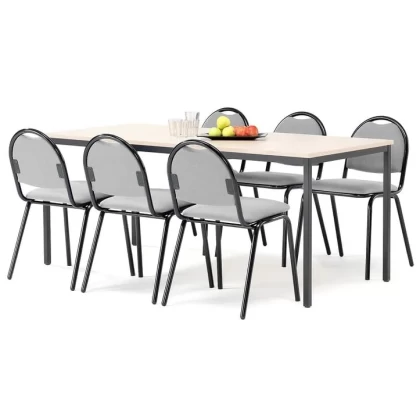 Stoličky majú ergonomické sedáky s integrovaným zaobleným operadlom, takže vám zaručia maximálne pohodlie sedák s vankúšom v poťahu z eko kože v kombinácii podnožia z dreva v dekore buk. Korpus stoličky je z sivého húževnatého a pevného plastu, sedák je polstrovaný z kvalitnej PU peny a potiahnutý eko kožou v sivom odtieni, korešpondujúcou s farbou korpusu. Použité materiály sú veľmi odolné a ľahké na údržbu a čistenie. Stôl má nohy v dekoru buk a doska stolu z MDF.