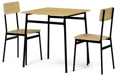 Tento jídelní set značky Autronic je ideální volbou pro menší prostory. Set obsahuje čtvercový stůl a dvě židle, které se svým industriálním designem dokonale hodí do moderních interiérů. Deska stolu i sedáky jsou vyrobeny z odolného MDF s dekorem divokého dubu. Černé kovové nohy dodávají sestavě stabilitu a moderní kontrast. Tento set je ideální pro dvě osoby a je vhodný zejména do menších jídelen nebo kuchyní. Montáž je snadná a rychlá, ideální řešení pro moderní bydlení.