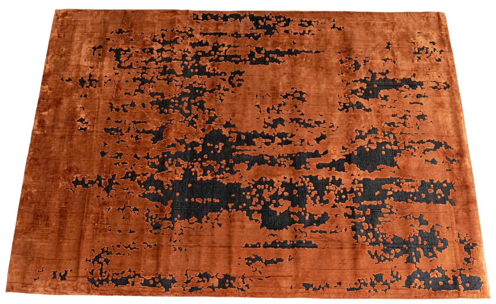 Zaujímavý obdĺžnikový koberec s hrdzavo-čiernym vzorom.