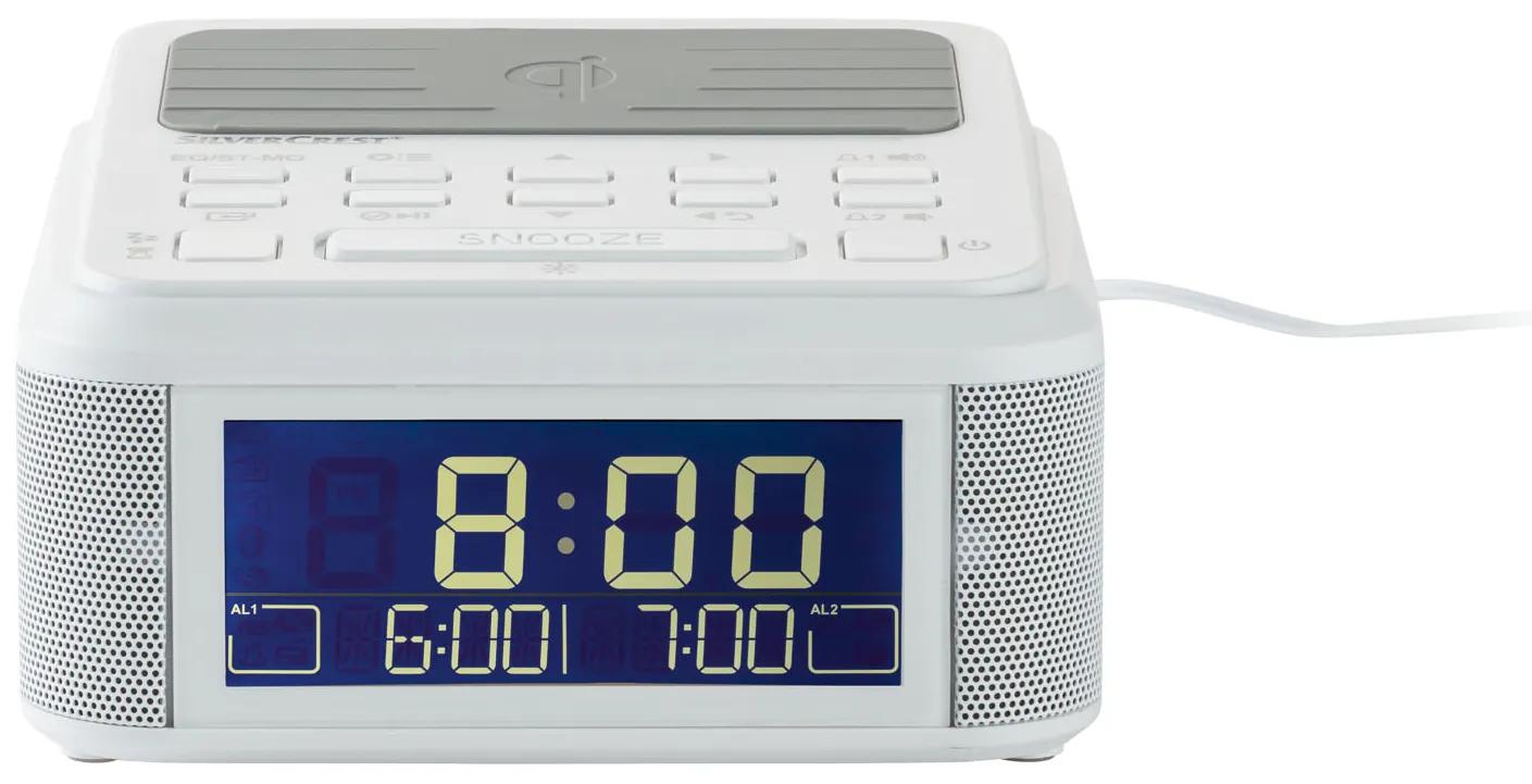 60 miest na uloženie do pamäte (30 x Dab+, 30 x Ukv) Ukv: automatické ukladanie staníc (Ams), automatické a manuálne vyhľadávanie staníc Dab: automatické vyhľadávanie staníc Automatické stmievanie displeja medzi 23:00 a 5:00 hod. 2 časy budenia: buď rádiom alebo budíkom Funkcia spánku a opakovaný alarm pri budení S časovaným vypínaním Bezkáblový príjem hudby zo smartfónu alebo tabletu Automatická synchronizácia presného času Backup funkcia na nastavenia alarmu a pamäťových miest na uloženie vysielačov 2 možnosti nabíjania: bez kábla pomocou Qi alebo prostredníctvom USB Nabíjanie bez kábla pomocou nabíjacej Qi podložky (predpokladom je kompatibilný koncový prístroj) Integrovaná drôtová anténa Vrátane modulu sieťového zdroja (dĺžka kábla: 150 cm) Dekorácia nie je súčasťou balenia Smartfón nie je priložený Technické údaje Výkon na audiovýstupe: 2 x 4,0 W RMS USB výstup: 5 V/1 A AUX vstup a prípojka na slúchadlá (3,5 mm konektor) Rozmery 14,9 x 8,2 x 14,9 cm (Š x V x H) Dĺžka sieťového kábla: 150 cm Hmotnosť cca 660 g
