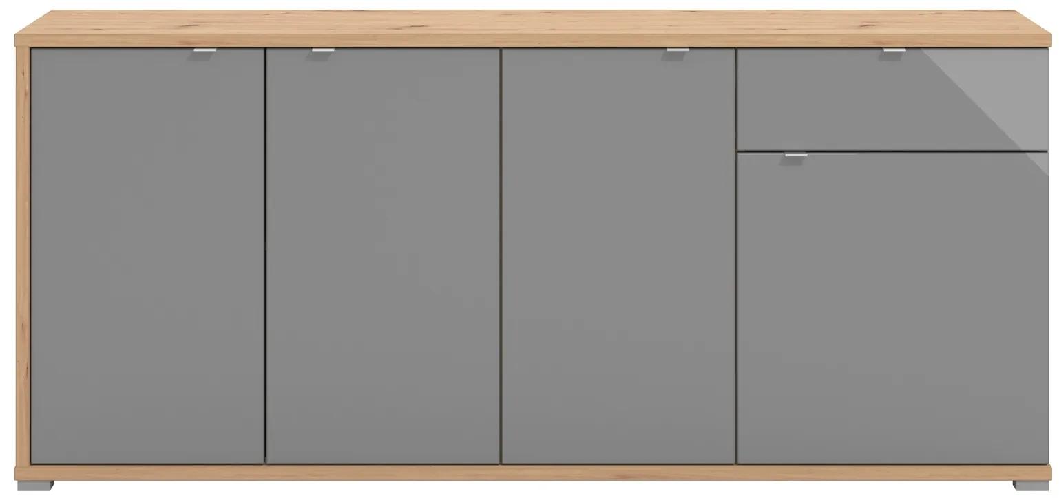 Komoda ponúka úložný priestor v 1 praktickej zásuvke a 3 dvierkami krytých skrinkách. Každá zo skriniek ukrýva 1 vnútornú policu. Celá komoda je nesená nízkymi nôžkami. Na šedom povrchu je nalepené sklo, ktoré utvára lesk nábytku, ale taktiež prakticky zvyšuje odolnosť proti oderu a bežnému opotrebovaniu.