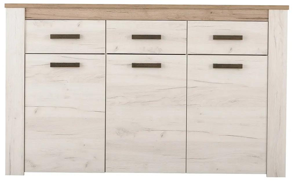 Komodu zdobia plastové úchytky, ktoré verne imitujú kov. Úložný priestor tvoria tri zásuvky a troje dvierka. Za všetkými dvierkami sa nachádza jedna polica. Komoda nájde využitie v každej miestnosti. Či už do nej plánujete umiestniť oblečenie, využívať ju ako príborník či bielizník. Komoda je vyrobená z kvalitného lamina, ktoré vyniká ľahkou údržbou a mechanickou odolnosťou. Rám a horná doska majú hrúbku 25mm, ostatné časti 16mm. Horná doska je vybavená ABS hranami. Rozmery široké komody Henry sú 160×36,5x98cm (š, h, v).