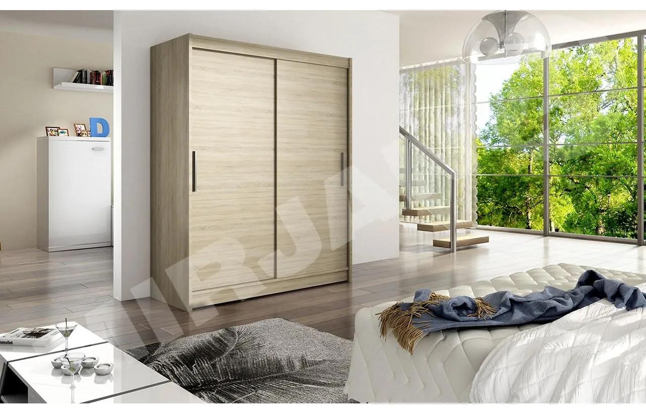 Šatníková skriňa Presto I zapadne do obývacej izby alebo spálne. Predné fronty majú ozdobné zrkadlá, ktoré vizuálne zväčšia miestnosť. Šatník je vybavený hliníkovým systémom posuvných dverí. Všetky časti oblečenia môžu byť zavesené na namontovanú tyč na vešiaky a uložené na priestranné police. Do skrine do spálne sa dajú umiestniť aj väčšie predmety, ako sú kufre alebo sezónna obuv. Nábytok bol vyrobený z laminovanej dosky.Rozmery:šírka: 150 cmvýška: 200 cmhĺbka: 58 cmFarby: možnosť výberu farieb tuPrevedenie:drevotriesková doska laminovaná 16 mm,systém posuvných dverí,vodiace lišty od firmy Sevroll, systém Micra,hliníkové lišty,osvetlenie LED RGB je možné si doobjednať za príplatokZáručná doba: 24 mesiacov