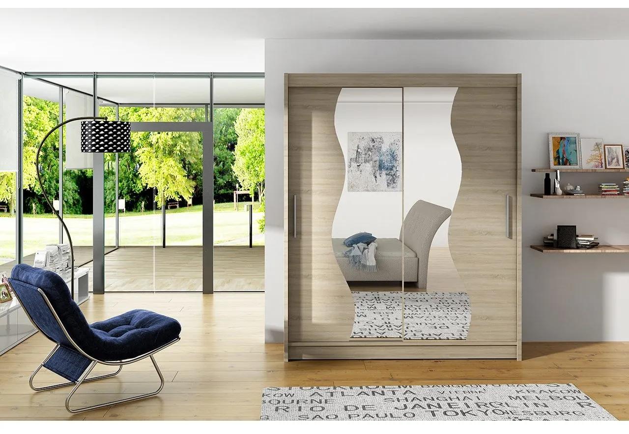 Šatníková skriňa Presto S je veľmi obľúbený model, ktorý ponúka funkčné a módne riešenia.Na prednej strane posuvných dverí je zrkadlo s dekoratívnym tvarom vlny. Za zmienku tiež stojí, že posuvný systém pracuje ľahko a ticho – a to vďaka použitým hliníkovým vodidlám.Skriňa Presto je k dispozícii v niekoľkých farebných variantoch, ktoré dokonale ladia s modernými aj tradičnými interiérmi. Nábytok je doplnený striebornými držadlami. Okrem toho môžete vylepšiť šatník v miestnosti pomocou LED osvetlenia RGB, ktoré je k dispozícii ako doplnková možnosť.Nielen vzhľad šatníka, ale aj jeho interiér má čo ponúknuť. Skriňa je vybavená množstvom priestranných políc a tyčou na zavesenie vešiakov.Rozmery:šírka: 150 cm,výška: 200 cm,hĺbka: 58 cmMateriál:laminovaná doska s hrúbkou 16 mm,hrany zakončené ABS dýhou,systém posuvných dverí,hliníkové vodítka Sevroll, systém Micravertikálne zrkadlá. stredná veľkosť, na prednej strane šatníka,vybavené tyčou a priestrannými policami,strieborné rukoväte,RGB LED osvetlenie ako doplnková možnosť za príplatok (15 variabilných farieb + diaľkové ovládanie)Záruka: 24 mesiacov
