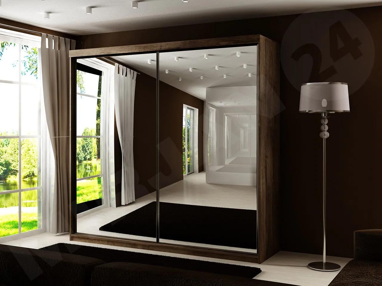 Skriňa so zrkadlom Sahara 200 prináša poriadok a harmóniu do obývačky, spálne či šatníka. Žiar zrkadiel zdobiacich čelá šatníka efektne zvýrazní štýl vášho aranžmánu, má aj funkčné úlohy – opticky zväčší priestor, dodá miestnosti ľahkosť a sviežosť. Oceňte nielen krásu šatníka s posuvnými dverami, ale aj praktické aspekty – vnútro šatníka vypĺňajú priestranné police a tyč na šaty. Premyslené usporiadanie úložných zón znamená, že ich tam uložíte oveľa viac ako v štandardnej šatníkovej skrini.Rozmery:šírka: 200 cm,výška: 200 cm,hĺbka: 62 cmPrevedenie:laminovaná drevotrieska 16 mm,okraje zakončené PVC dyhou,systém posuvných dverí – hliníkové ložiská,hrany dverí zakončené hliníkovými úchytkami, ktoré zabraňujú prehýbaniu dverí,vysoko kvalitné armatúry,bar a police vo vnútri,zrkadlo vpredu – na doske 12 mm je nalepené zrkadlo s hrúbkou 3 mm (doska, na ktorej je zrkadlo nalepené, nie je zhodná s farbou šatníka),LED osvetlenie ako doplnková možnosť (vo verzii RGB je súčasťou balenia diaľkové ovládanie)Záruka: 24 mesiacov