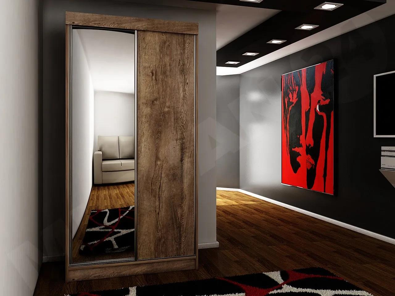 Posuvná skriňa so zrkadlom Sahara 23/100 sa skvele hodí do spálne, obývačky alebo predsiene. Veľké zrkadlo zdobiace jedno z čiel šatníka opticky zväčší interiér a navyše vám umožní vidieť odraz celej vašej postavy predtým, než vyjdete von. Vo vnútri je posuvná skriňa vybavená radom priestranných políc a tyčou na šaty. Do takto riešeného úložného priestoru bez problémov umiestnite oblečenie, ale aj krabice s topánkami.Šatníková skriňa so zrkadlom je vyrobená z pevných komponentov, vďaka čomu si môžete byť istí spoľahlivosťou a dlhoročnou spokojnosťou s používaním.Rozmery:šírka: 100 cm,výška: 200 cm,hĺbka: 62 cmPrevedenie:laminovaná drevotrieska 16 mm,okraje zakončené PVC dyhou,systém posuvných dverí – hliníkové ložiská,hrany dverí zakončené hliníkovými úchytkami, ktoré zabraňujú prehýbaniu dverí,vysoko kvalitné armatúry,bar a police vo vnútri,jedno predné – 16 mm doska, druhé – 3 mm hrubé zrkadlo nalepené na 12 mm doske (doska, na ktorej je zrkadlo nalepené, nie je zhodná s farbou šatníka),LED osvetlenie ako doplnková možnosť (vo verzii RGB je súčasťou balenia diaľkové ovládanie)Záruka: 24 mesiacov