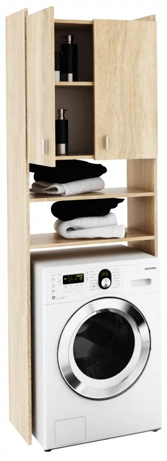 Táto praktická skrinka nad práčku vám určite ušetrí miesto vo vašej kúpeľni. Skrinka má vo vrchnej časti dvoje dvere, za ktorými sa nachádzajú dva odkladacie priestory rozdelené policou. Pod dvierkami sú dve poličky. Je vyrobená z laminovanej DTD, jej farba je dub sonoma a hrúbka materiálu je 16 mm. Rozmery skrinky sú 64x30x63,6 cm a regálová polica má rozmery 64x32x123 cm. Priestor na práčku má rozmery 60,8x32x85,2 cm a skrinka je vhodná na pračku s maximálnymi rozmermi 60 x 85 cm. Výška medzi policami je 36,2 cm a priestor nad skrinkou prečnieva o 4 cm. Tento kvalitný slovenský výrobok je dodávaný v demonte.