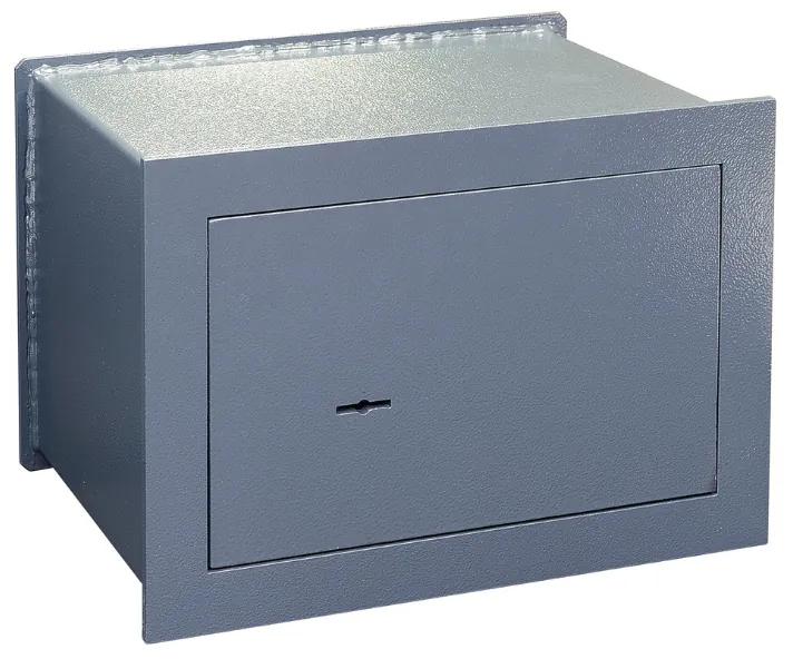 · jednoplášťový oceľový trezor · hrúbka stien 2 mm, hrúbka dverí 6 mm · mechanický zámok s 2 kľúčmi · maximálny uhol otvorenia je 90° · farba sivá (RAL 7016)