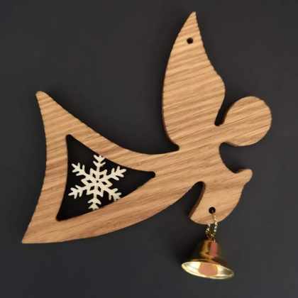 AMADEA Drevená ozdoba z masívu s vkladom – anjel s vločkou a zvončekom 11 cm