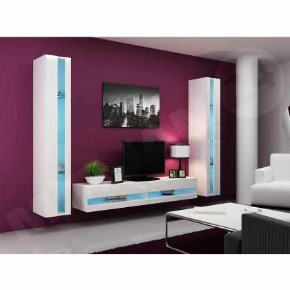 Obývacia stena Zigo II, Osvetlenie: osvetlenie LED modré, Farby: biela / biely lesk