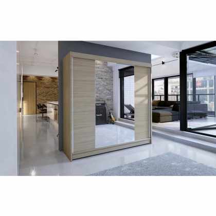 Šatníková skriňa s posuvnými dverami Bar I, Farby: biela / sonoma + zrkadlo, Osvetlenie: bez osvetlenia