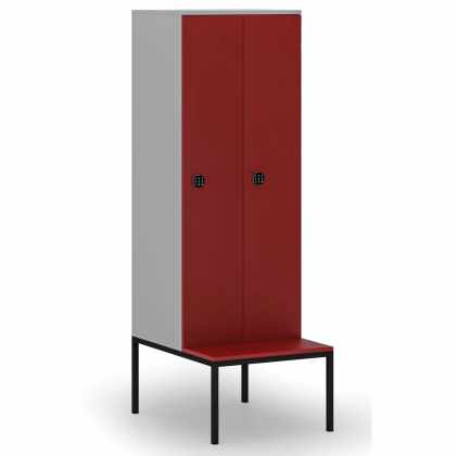 Drevená šatníková skrinka s lavičkou, 2 oddiely, 1871 x 600 x 500/800 mm, kódový zámok, sivá / červená