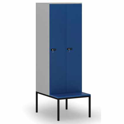 Drevená šatníková skrinka s lavičkou, 2 oddiely, 1871 x 600 x 500/800 mm, mechanický kódový zámok, sivá / modrá