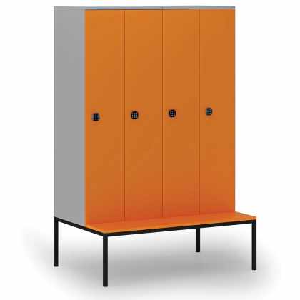 Drevená šatníková skrinka s lavičkou, 4 oddiely, 1871 x 1200 x 500/800 mm, kódový zámok, sivá/oranžová