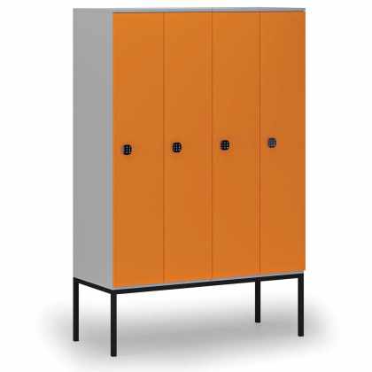Drevená šatníková skrinka s podnožou, 4 oddiely, 1871 x 1200 x 500 mm, kódový zámok, sivá/oranžová