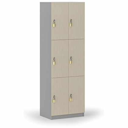 Drevená šatníková skrinka s úložnými boxmi, 6 boxov, otočný zámok, sivá/breza