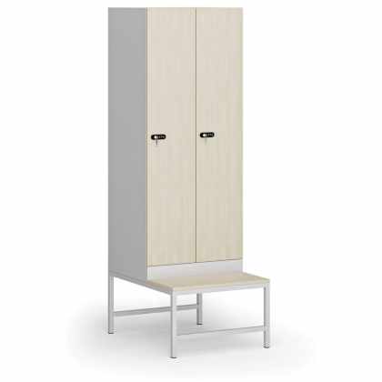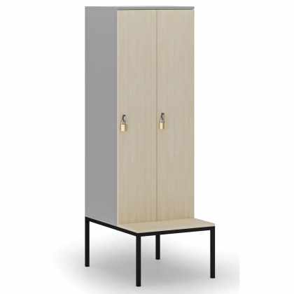 Šatníková skrinka s lavičkou, 2 oddiely, 1875 x 600 x 500/800 mm, mechanický kódový zámok, laminované dvere, breza
