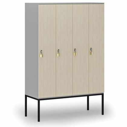 Drevená šatníková skrinka s podnožou, 4 oddiely, 1871 x 1200 x 500 mm, otočný zámok, sivá/breza