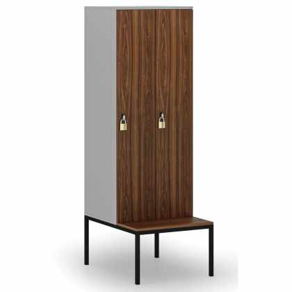 Drevená šatníková skrinka s lavičkou, 2 oddiely, 1871 x 600 x 500/800 mm, otočný zámok, sivá/orech
