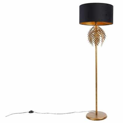 Vintage stojaca lampa zlatá s bavlneným tienidlom čierna – Botanica