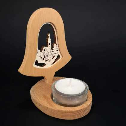 AMADEA Drevený svietnik zvonček s vkladom – kostol, masívne drevo, výška 10 cm
