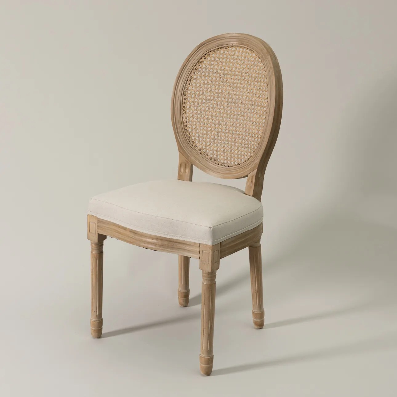 Štýlová čalúnená stolička vyrobená z dreva, ratanu a látky v prírodnej farbe. Schválne starené drevo v prírodnej farbe, charakteristické guľaté operadlo a vyrezávané nohy dodávajú nábytku dávku elegancie navyše. Pohodlné sedadlo svetlej béžovej farby zaručuje komfortne trávený čas za stolom a elegantný vzor k sebe iste pritiahne pozornosť. Úžasne vyzerá v štýle shabby chic a v klasickom štýle. Rozmery: šír. 49 cm, hĺ. 55 cm, výš. 95 cm. Materiál: drevo čínsky céder/ratan/látka. Farba: bielený dub/ svetlý béžový melír.Maximálne zaťaženie stoličky je: 125 kg.Na samoobslužnú montáž.